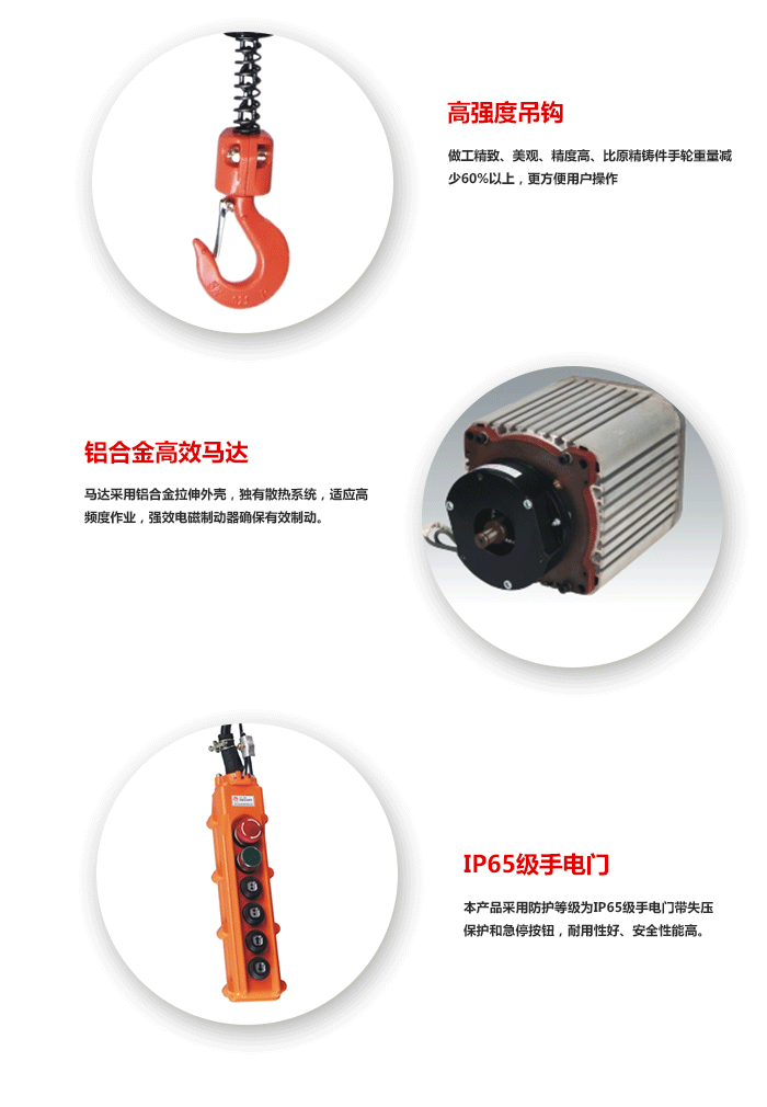 5、極限開關:吊上吊下都有極限快關裝置,使電機自動停止,反防止鏈條超出,確保安全。