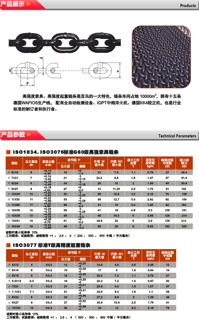 高強度索具、高強度起重鏈條式青青青草视频的一大特色,鏈條車間占地10000平方米,擁有十五條德國WAFioses生產線,配有全自動檢測設備、IGPT中頻淬火機、德國KK4矯正機,也是行業標準的製定者和執行者。